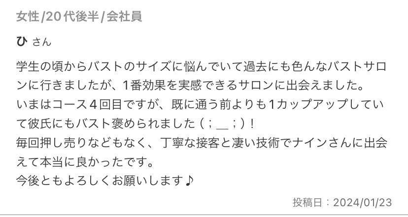 毎回押し売りなどもなく、丁寧な接客と凄い技術でナインさんに出会えて本当に良かったです。お店の雰囲気も清潔感と可愛さが詰まった場所で居心地も最高ですし、他の方とすれ違うこともほとんど無いため、緊張や恥ずかしさなど気をすることなく施術を受けられるところも気に入っているポイントです!